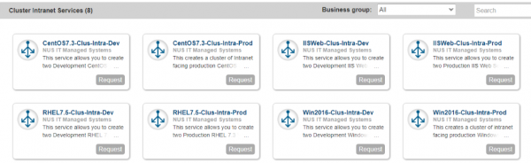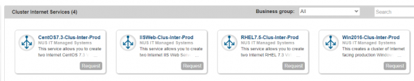 For IT administrator that requires the Virtual Machine to communicate internally within NUS network only, you may choose this service. Cluster Intranet Services support both production and development Servers deployment. Below is the screenshot of this service in the nCloud portal: